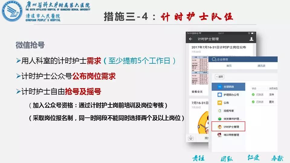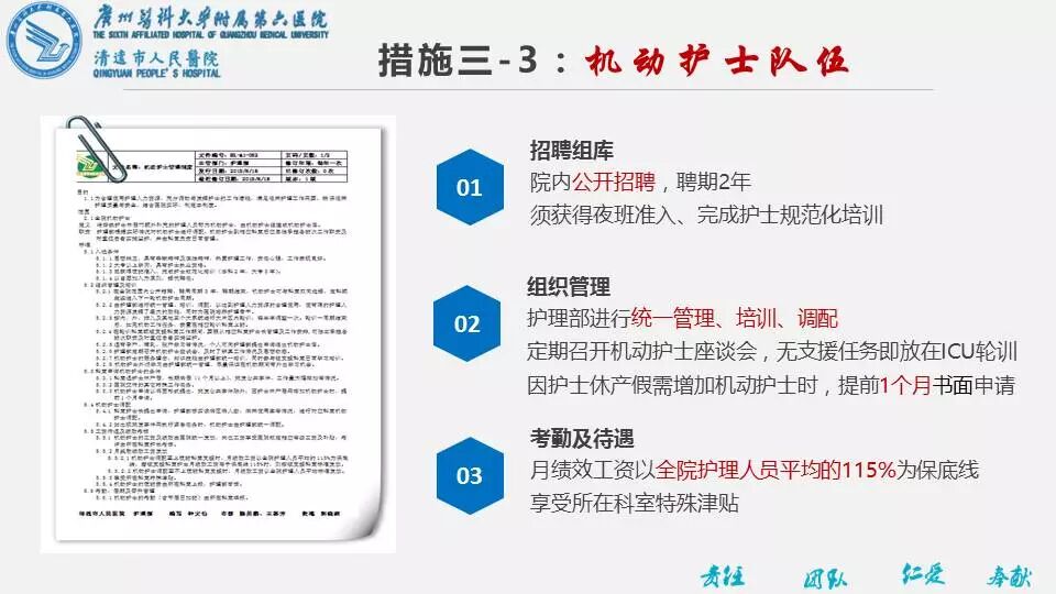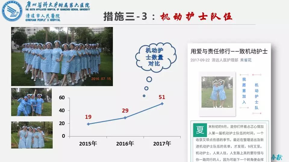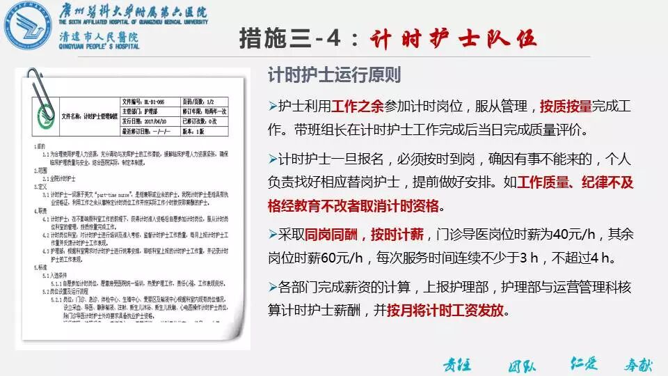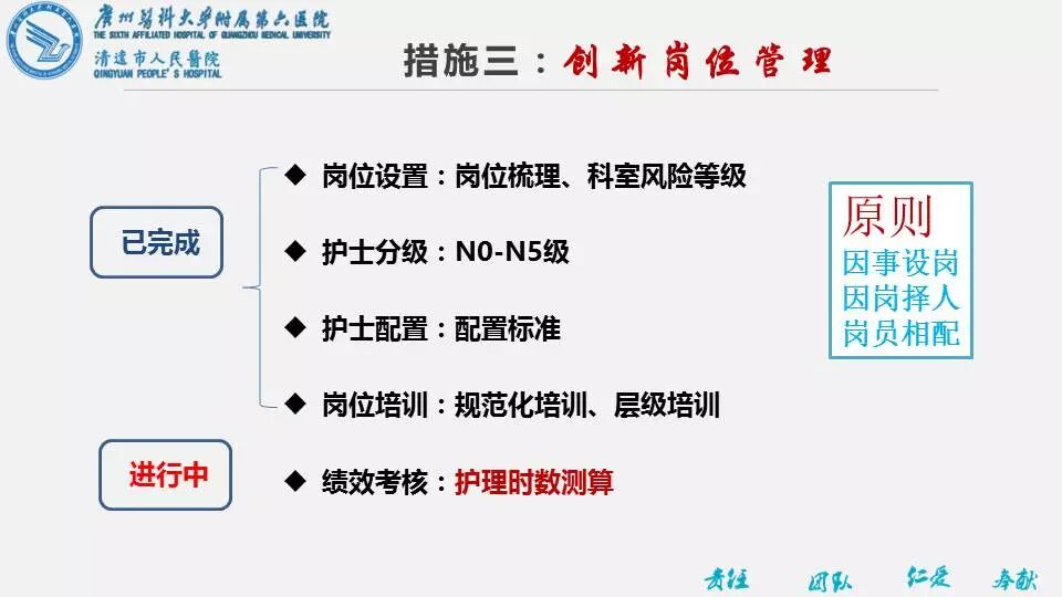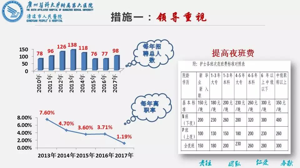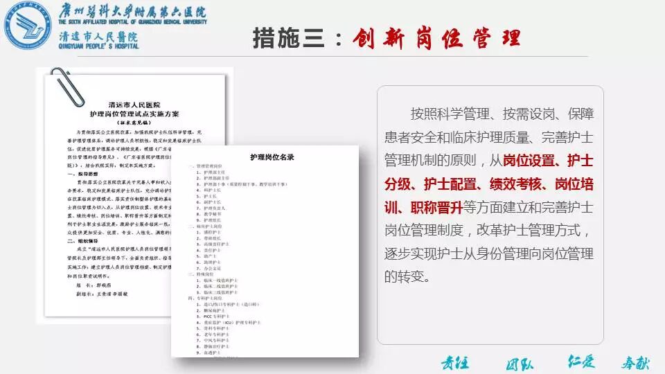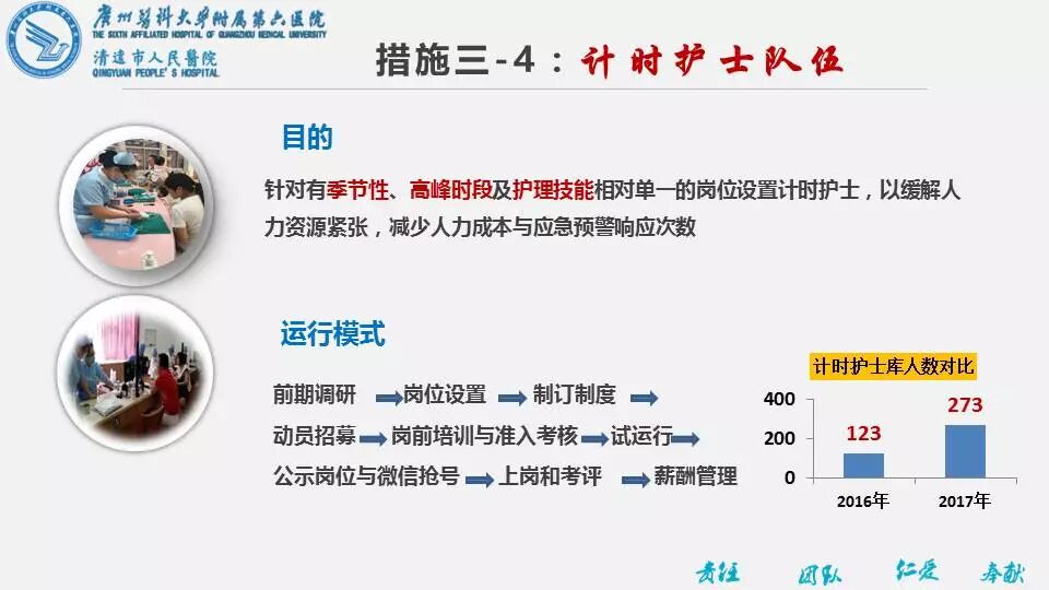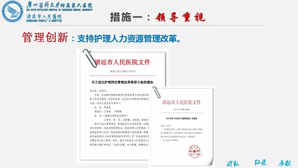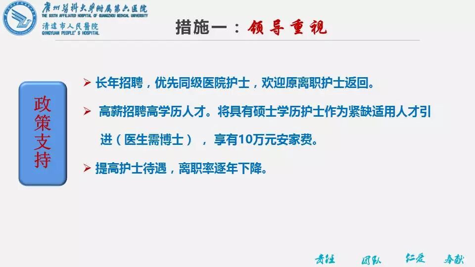 为应对临床出现的护理人力不足危机,清远市人民医院护理部采取寻求领导支持完善后勤保障系统,实施岗位管理、测量护理工时、盘活现有护理人力,利用信息化系统减轻护理工作量等方法进行护理人力资源管理,取得了显著的成效。具体措施如下: