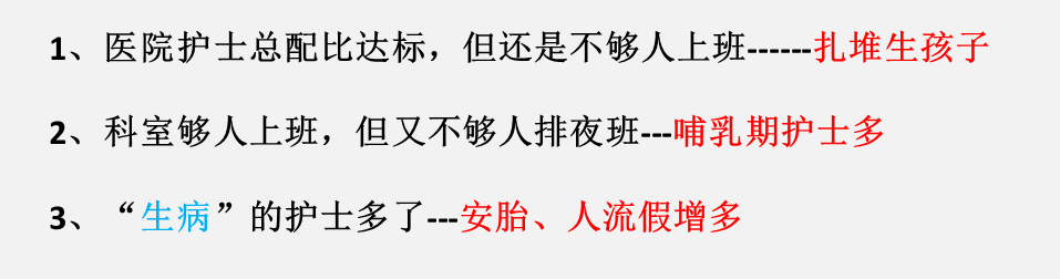 清远市人民医院目前有执业护士1070人,承担医院2010张病床的临床护理,总的床护比高于国家1:0.4的最低标准。然而在临床,近年来虽然护理人员总人数有了明显提高,但仍存在护理人员短缺、工作压力过大等问题,实际上部分科室的床护比并未达标,特别是2016年1月国家实施“全面二孩”政策以后,给护理人力资源管理带来了更大挑战,很多育龄护士扎堆生孩子,导致临床护理人力不足。具体表现为: