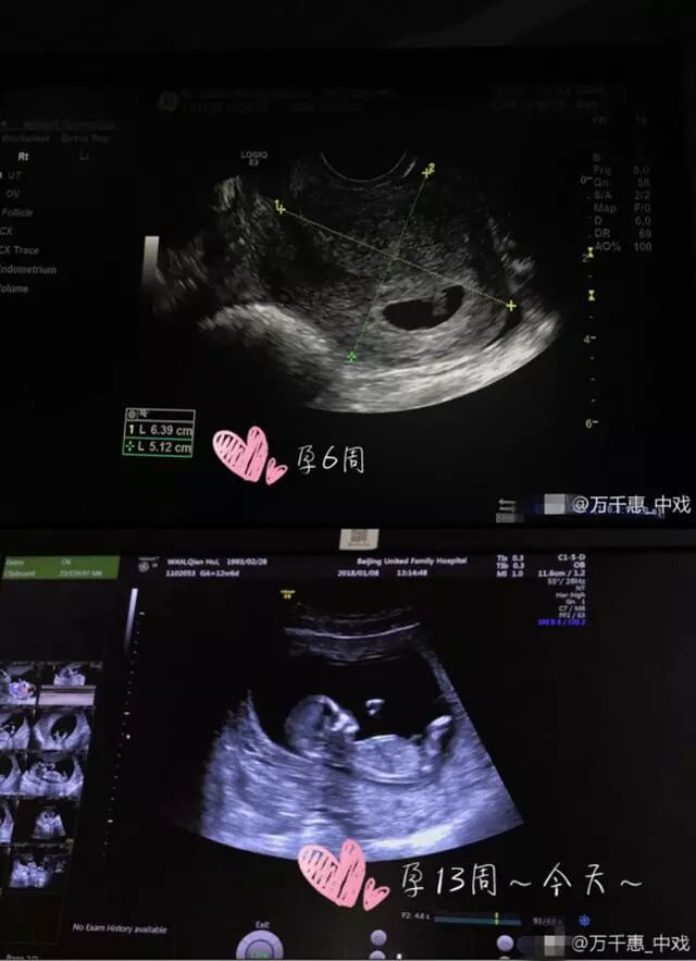 万千惠晒出的B超照。万千惠和三宝于去年6月举办婚礼,虽然两人有25岁的年龄差,但这并不影响二人的感情。夫妻俩经常毫不避讳地在人前秀恩爱,幸福之情羡煞旁人。