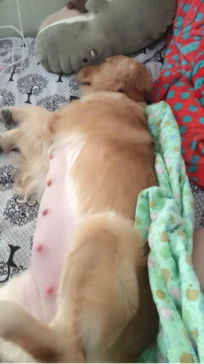 因为怀孕期间可能补得太好了,加上我家金毛不爱运动,所以预产期眼看就过了还是没有生产,等了一周还是没有结果,只是出来一点血泡,家人们也不放心就送到医院,医生检查后说狗宝宝胎位不正,需要剖腹产,我们当即就答应了~