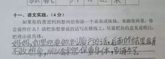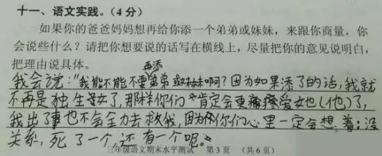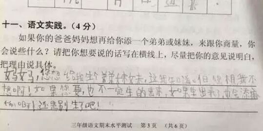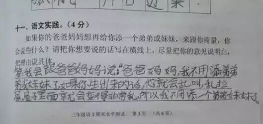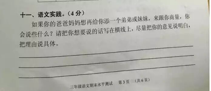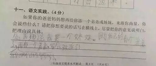 最近广州的小学生三年级语文考试题与时俱进地考起了二胎政策——“爸妈生二胎,老大啥感受?”。三年级小学生的答案让人笑趴了,爸爸妈妈表示伤不起!