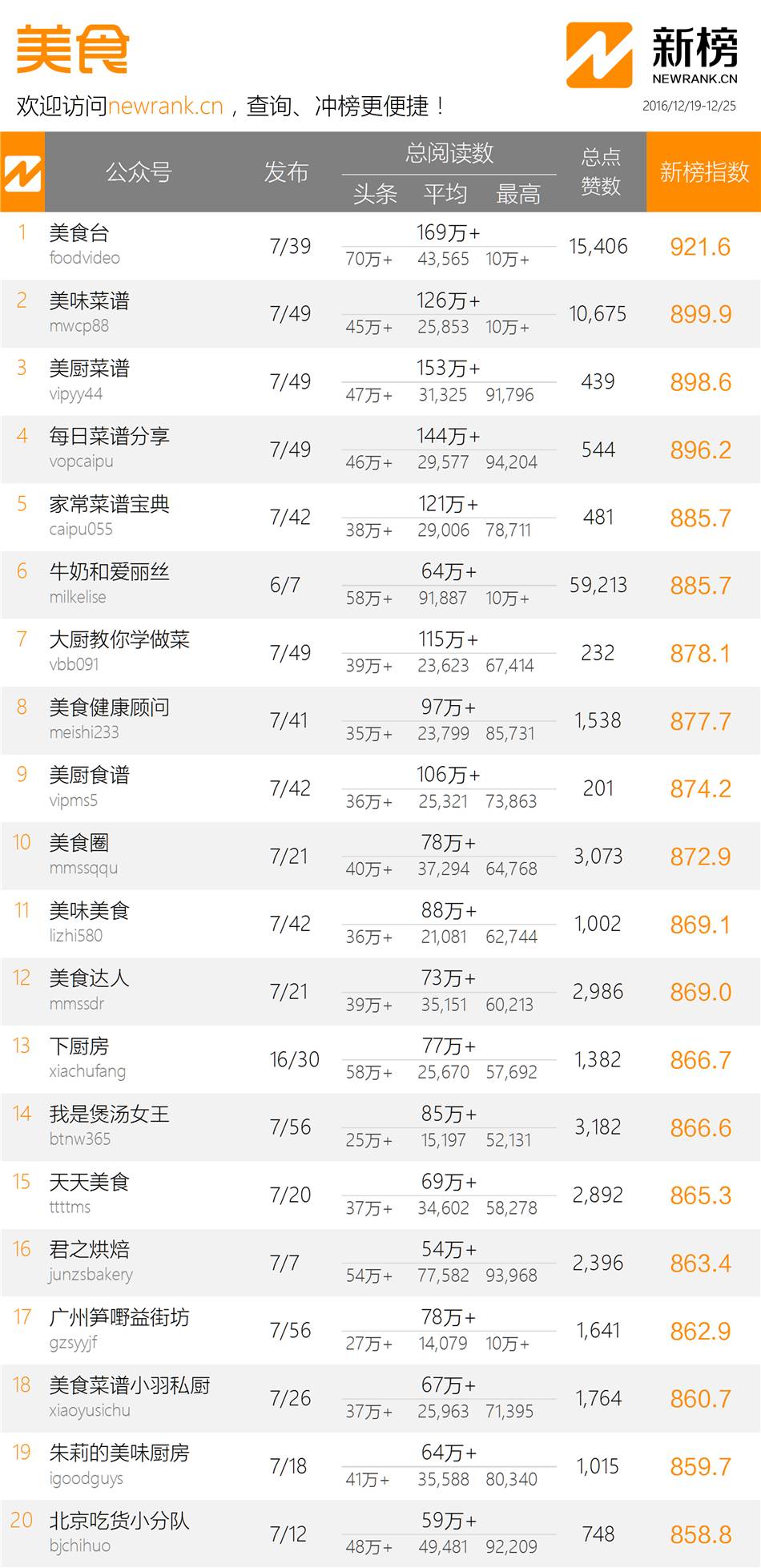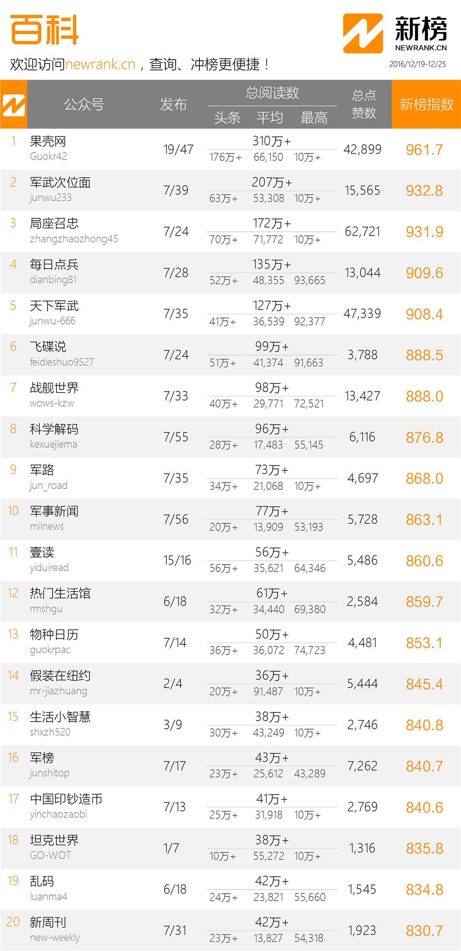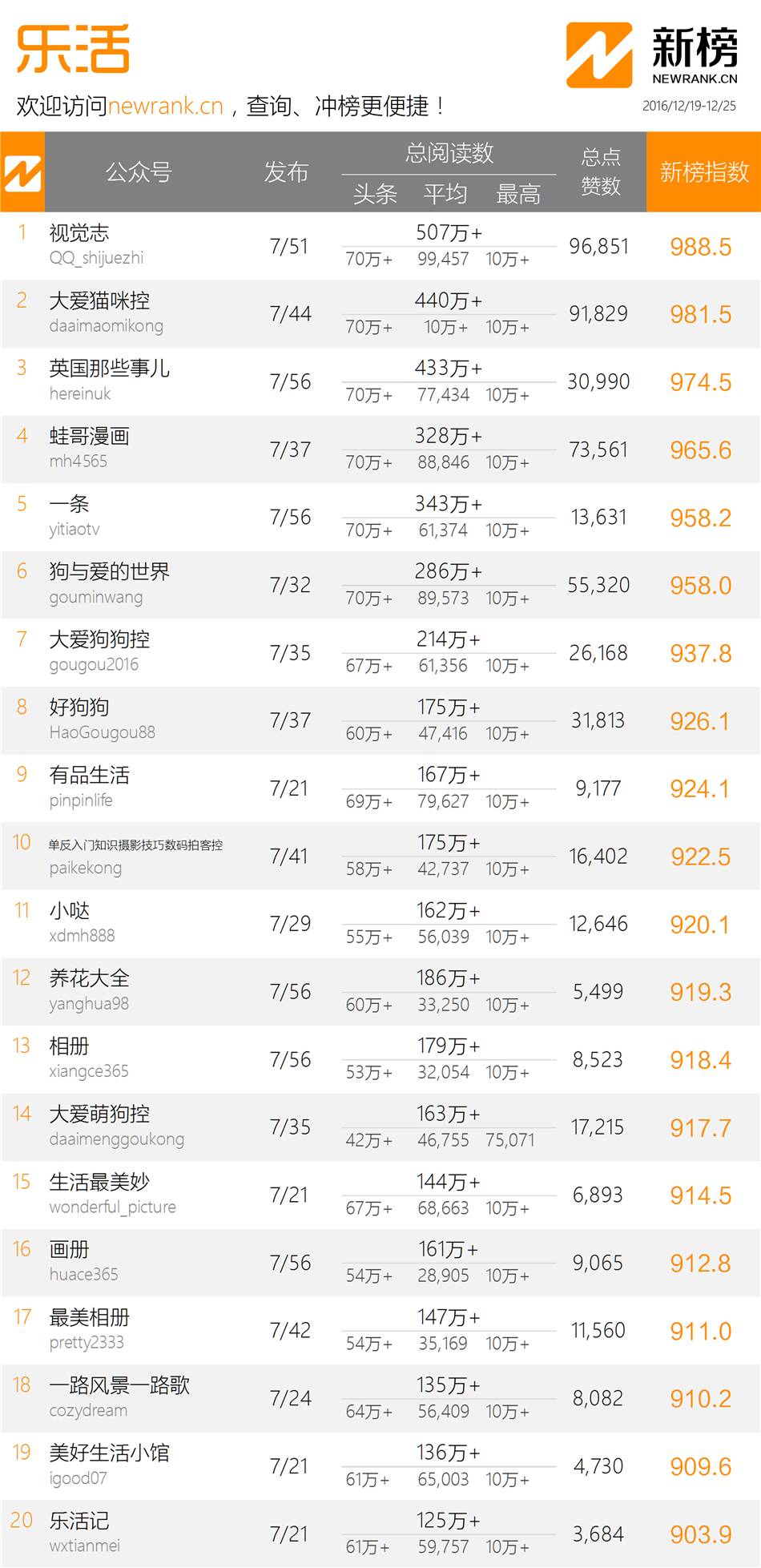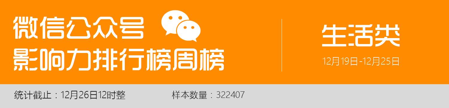 “微信公众号影响力排行榜周榜(生活类)”由新榜独家发布,榜单统计周期为12月19日到12月25日,统计截至26日12时整。