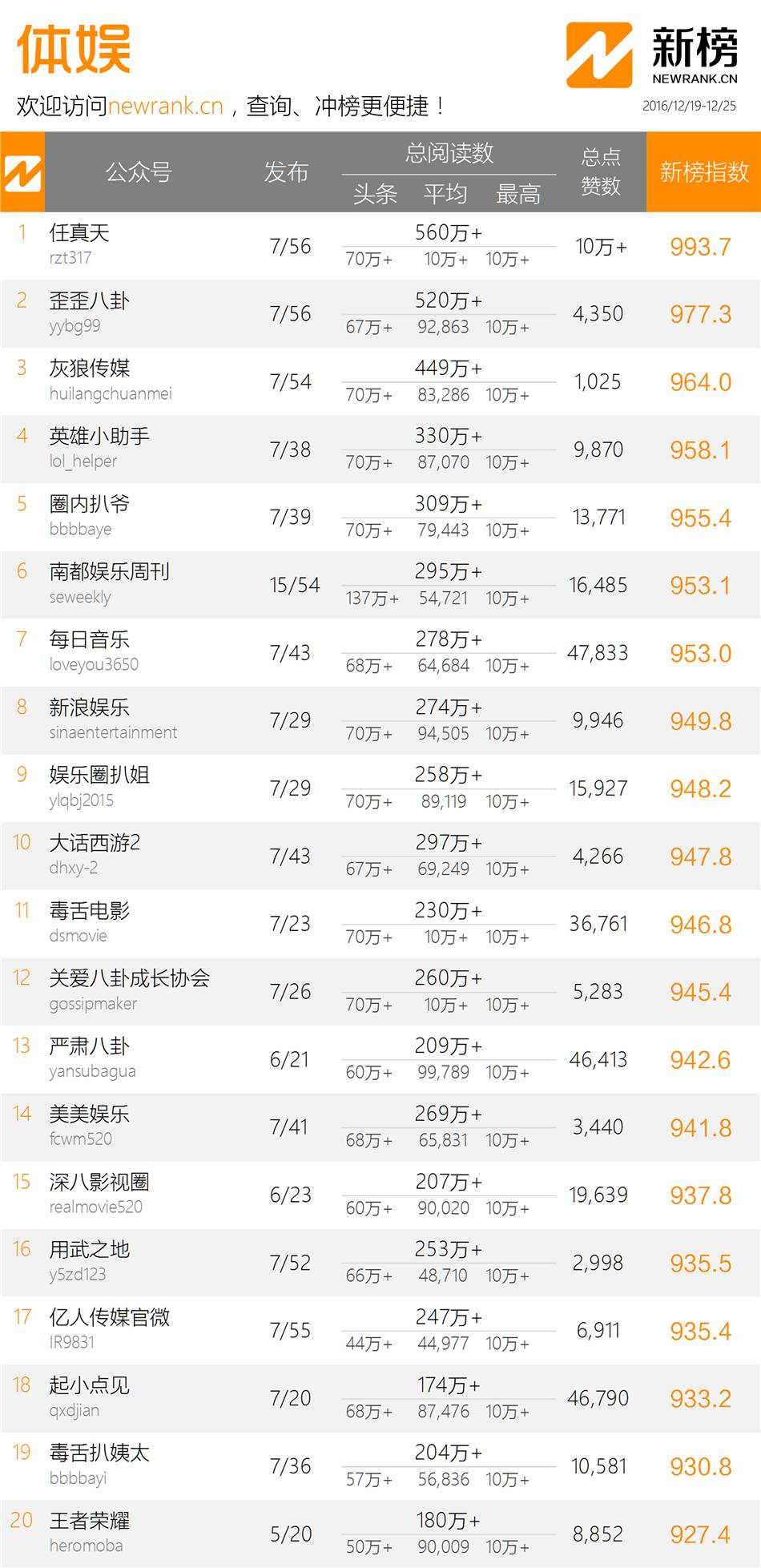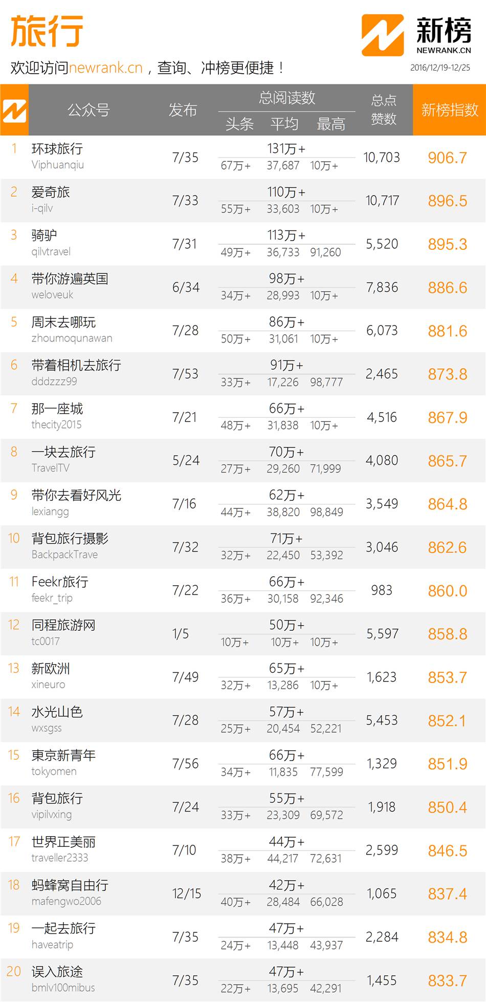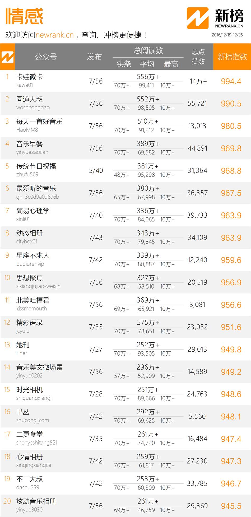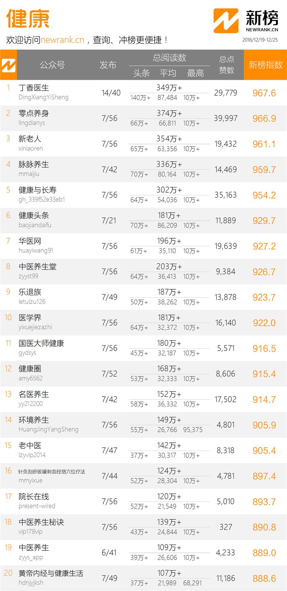 “微信公众号影响力排行榜周榜(生活类)”由新榜独家发布,榜单统计周期为12月19日到12月25日,统计截至26日12时整。