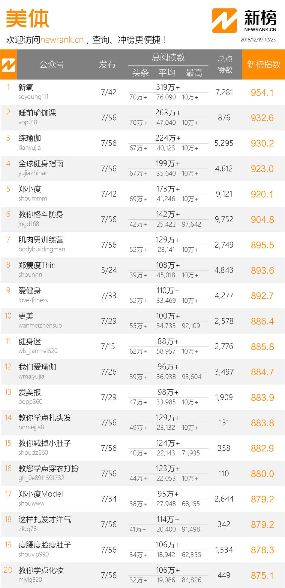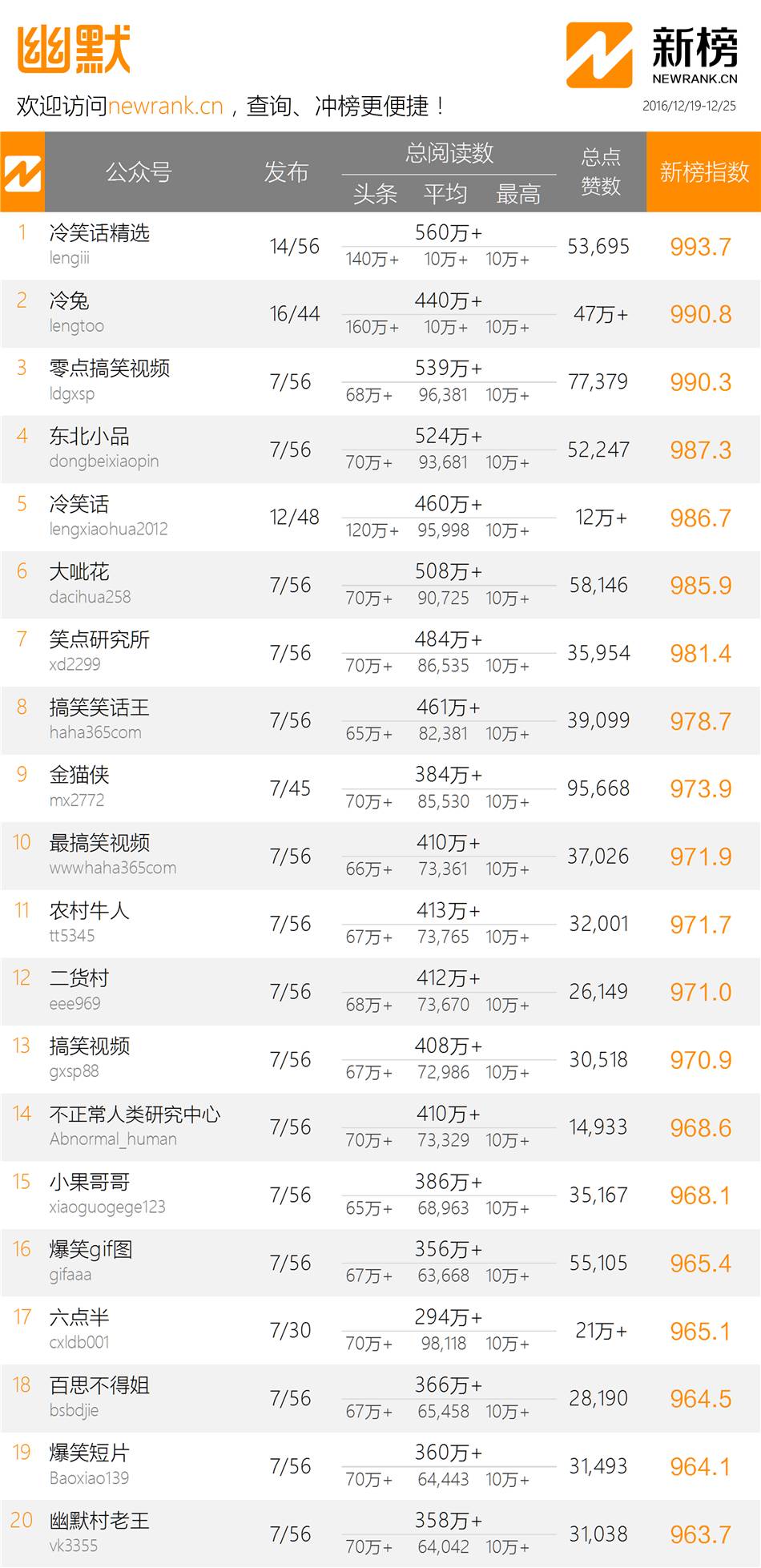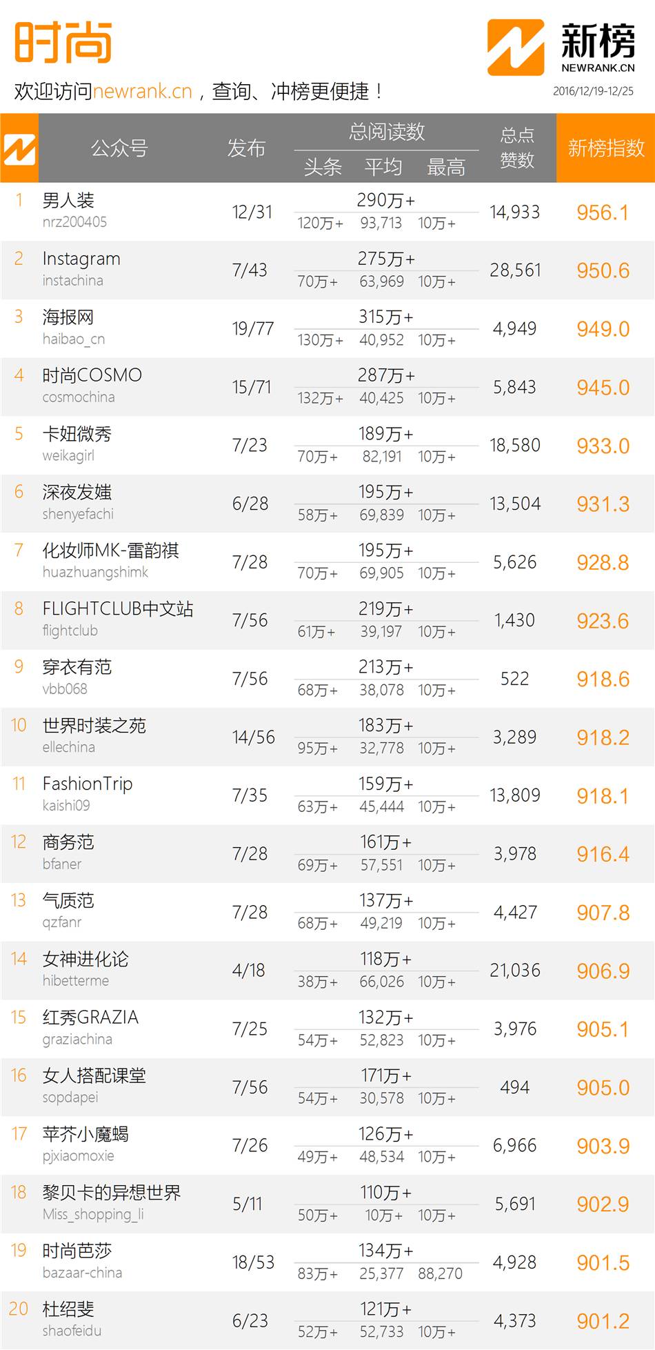“微信公众号影响力排行榜周榜(生活类)”由新榜独家发布,榜单统计周期为12月19日到12月25日,统计截至26日12时整。
