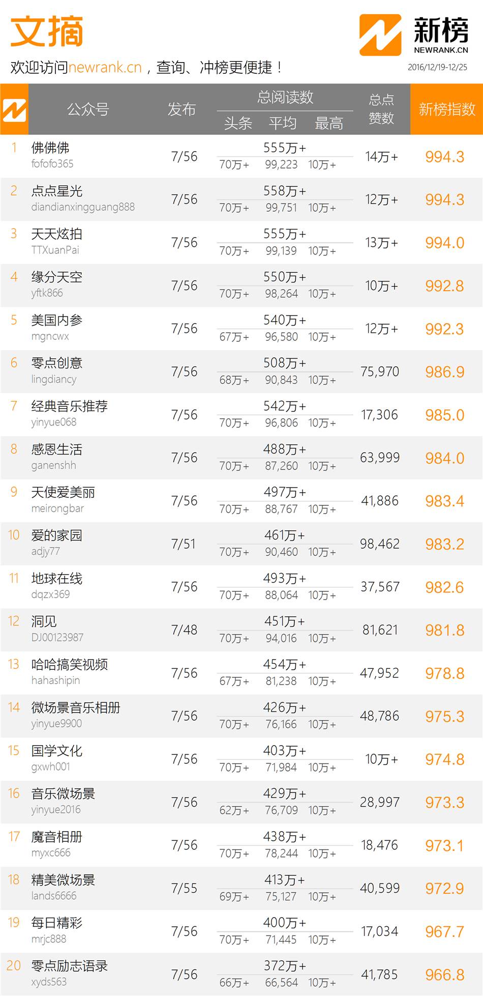“佛佛佛”蹿升五名,夺冠文摘榜。推文《明日冬至,祝福送上!》斩获10w+。