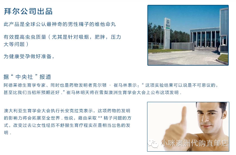 德国拜耳荣誉出品的这款宝贝,是男性孕前的必需品,它可以最大程度地提高精子的数量、质量与活力,在最短的时间内能最有效地提高受孕的机率,保证未来的宝宝最健康,最聪明。