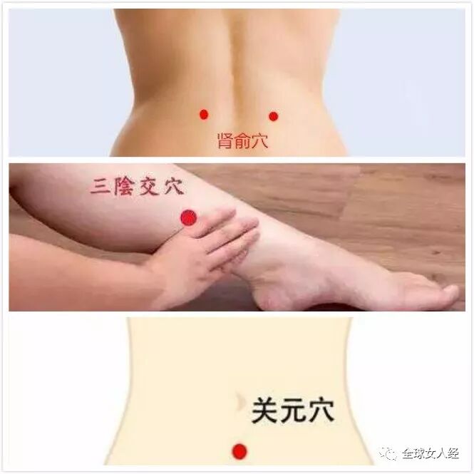 三阴交穴在小腿内侧,当足内踝尖下3寸,胫骨内侧缘后方凹陷处。关元又名丹田,在腹下部,前正中线上,脐下3寸处。是任脉经穴,又是任脉和足三阴经交会穴,为一身元气所在,具有通调冲任、调理气血之功效。肾俞穴位于第二腰椎棘突旁开1.5寸处,经属足太阳膀胱经。