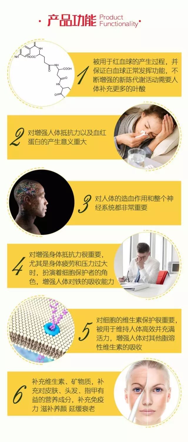叶酸是一种B族维生素,人的身体需要用它来生成红细胞、去甲肾上腺素和色拉托宁(神经系统的化学成分)。叶酸协助合成DNA(身体的遗传物质),维持大脑的正常功能,是脊髓液的重要组分部分。所以叶酸能保证胎儿神经系统的发育,防止神经管畸形的发生。