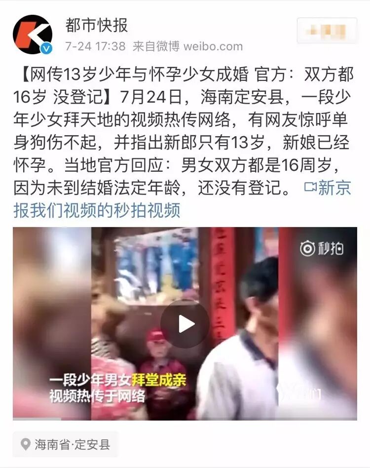 微博证实了两人是来自海南定安县的,两人都是16周岁!虽然还未够领证的年龄,但是两人必须按照村里的习俗先拜堂,这一则消息,激起了各路单身狗的敏感神经。
