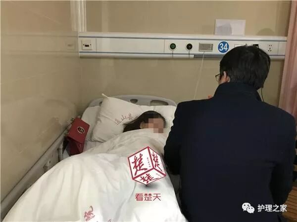 通山县人民医院妇科病房,被打护士朱女士躺在病床上,许多亲友和同事前来探望。