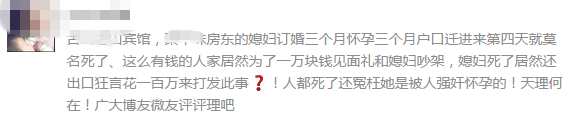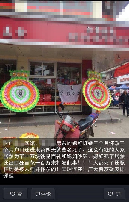 古山某宾馆,一房东的媳妇订婚三个月怀孕三个月户口迁进来第四天就莫名死了、这么有钱的人家居然为了一万块钱见面礼和媳妇吵架,媳妇死了居然还出口狂言花一百万来打发此事!人都死了还冤枉她是被人强奸怀孕的!天理何在?