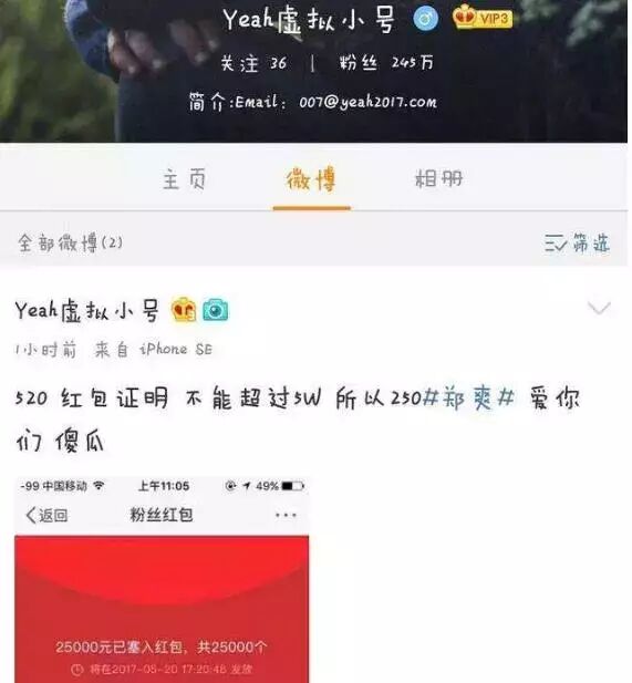 520当天,郑爽更是直接给粉丝发了2万多块微博红包。