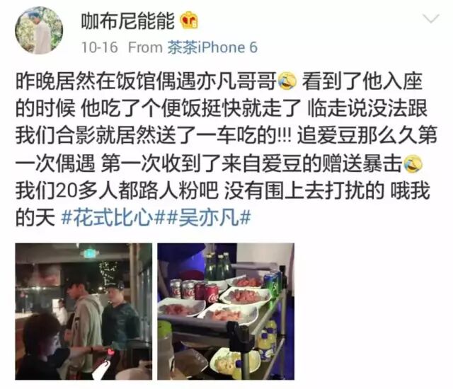 由于时间紧张,吴亦凡匆忙吃了饭就要走,临走时为了弥补粉丝不能合影的遗憾,干脆送了他们一车吃的。