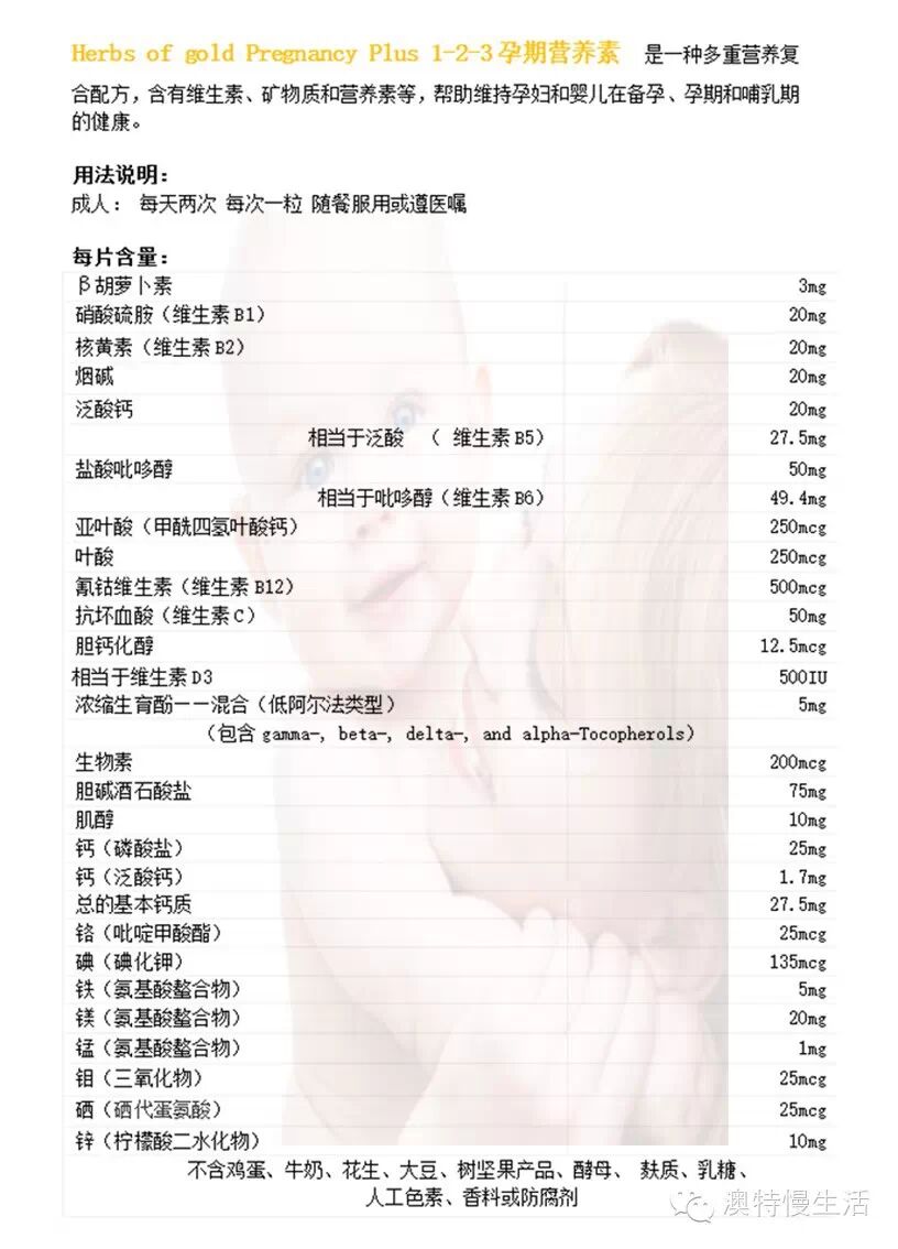 Herbs of gold孕期营养素,含孕前,孕中和哺乳期妈妈所需的各种微量元素和叶酸。科学配比,药房推荐,放心食用!一瓶搞掂1-2-3个时期的营养补充!!简简单单让妈妈健康,宝宝营养充足,每天两次,每次一片,随餐服用即可。