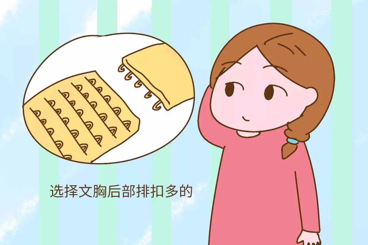 选择文胸后部排扣多的,这种的承托力较强,还可以自由调节,当乳房变大或是下围扩展时,可以通过调节排扣来满足胸部变化。