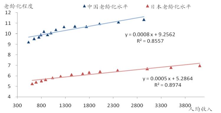 中日经济发展和老年人口占比的情况,可以看出伴随着经济增长,老龄化的趋势不可避免。但是在相同的经济发展水平上,中国的老龄化程度相当于日本的 2 倍。同时观测回归系数,发现伴随经济增长,中国老龄化的趋势也更快。