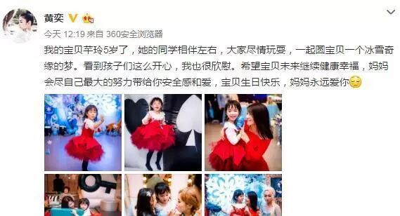 另一边,黄奕晒出了女儿芊玲5岁生日聚餐照,“她的同学相伴左右,大家尽情玩耍,一起圆宝贝一个冰雪奇缘的梦。看到孩子们这么开心,我也很欣慰。希望宝贝未来继续健康幸福,妈妈会尽自己最大的努力带给你安全感和爱,宝贝生日快乐,妈妈永远爱你”