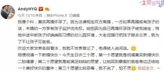 黄毅清抱怨黄奕怕因为再婚怀孕孩子被他接走,特地中途中断孩子好端端刚习惯的幼儿园环境,大老远强行把孩子搬去北京,就为了不让孩子见爸爸。黄奕因此再次上了热搜第一。