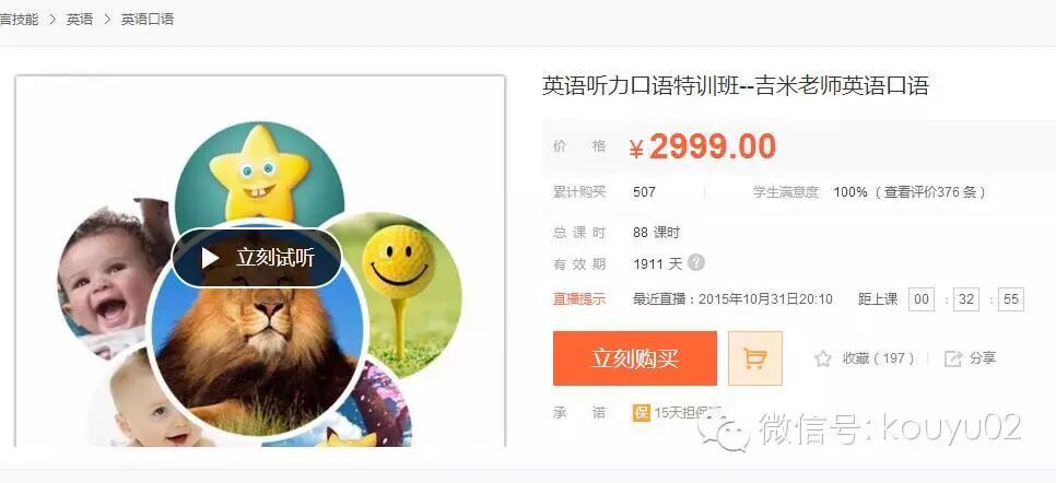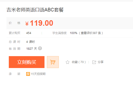 原价399元的ABC微信口语套餐,现在119元!推出8个月时间,目前已有454个学员全额付费报名学习,387个学员评价,100%好评率,你绝对值得享有。