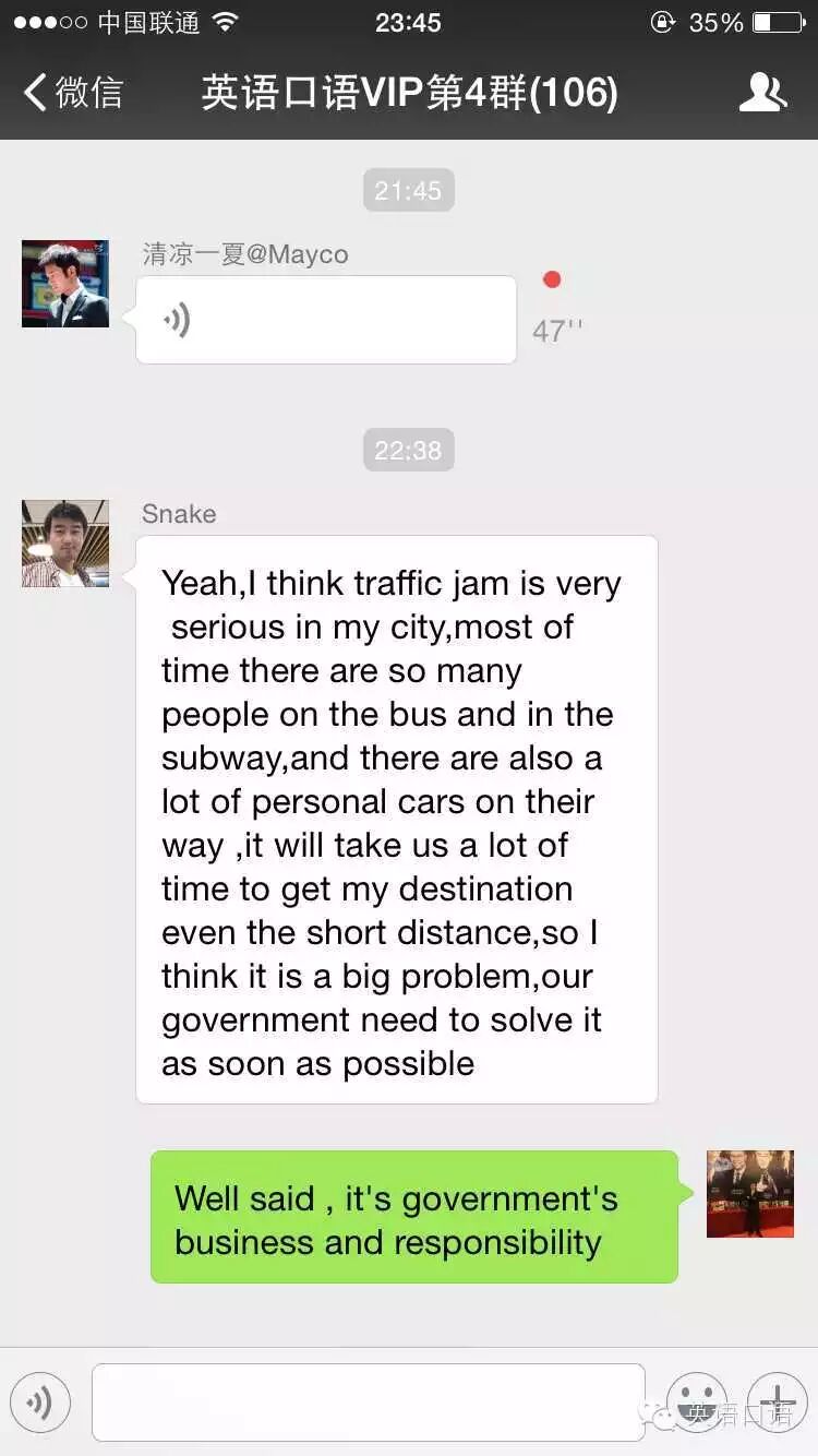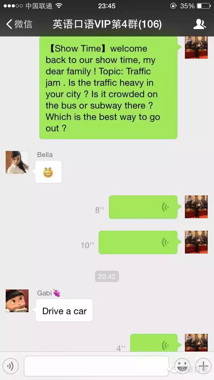 特训班微信群每天交流训练英语截图如下