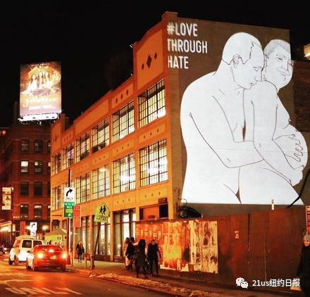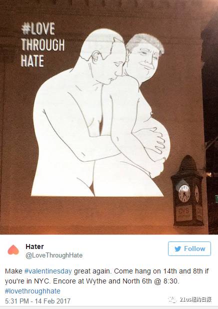 谁能想到,在Chelseahe 和Williamsburg的2座建筑楼外竟然挂出了一幅巨型的川普普京“秀恩爱”照片呢,更夸张的是特朗普的肚子还鼓了,怀孕了。