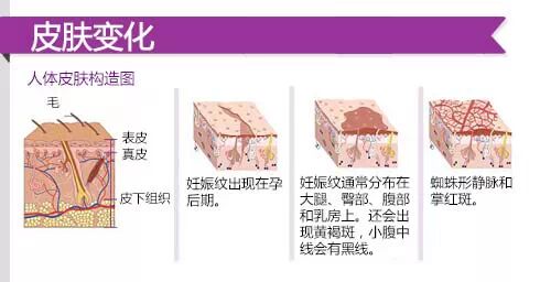 妊娠纹,是由于皮肤的拉伸所造成的疤痕,出现在孕后期。由于荷尔蒙的作用,皮肤和指甲会暗淡,色素沉着。高水平的雌激素会导致蜘蛛状或螺纹状静脉,手掌出现红斑。