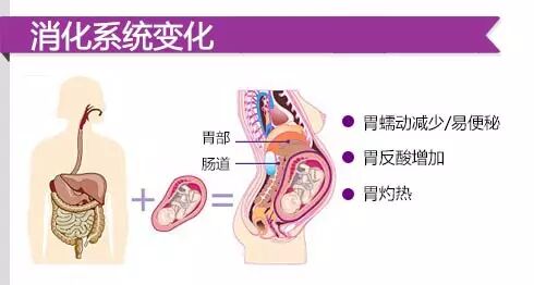 逐渐增大的子宫会慢慢压迫到胃部、肠道和其他邻近器官。激素黄体酮的分泌导致下食管括约肌位置下降,导致增加胃反酸和胃灼热。由于胃蠕动减少,孕妇更容易发生便秘。