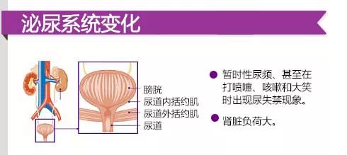 膨胀的子宫对膀胱、尿道和盆底肌形成了压力,会造成暂时性尿频、甚至在打喷嚏、咳嗽和大笑时出现尿失禁现象。