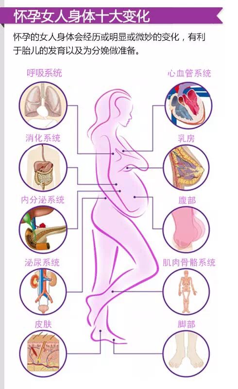 上图揭示了怀孕后的变化会影响女人身体的哪些部位。平均来讲,女人怀孕后会增重12-17kg,很多准妈妈抱怨怀孕后乳房下垂、出现妊娠纹和脚部水肿等等……