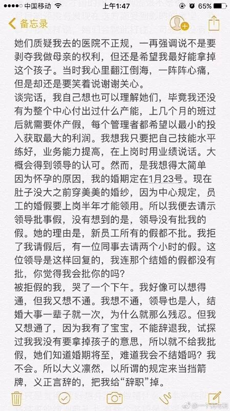 @让我掩埋:其实我是挺生气的。劝人打胎,非常不人道,该曝光,领导班子心理有问题。 但是我很想说。你们知道现在女性就业歧视有多么严重吗?女的要很优秀,才能得到一份好的工作。男的一般般就可以了。 你没为公司做一点贡献,公司要等你生小孩,生完小孩还要给你带薪产假,生育津贴。呵呵
