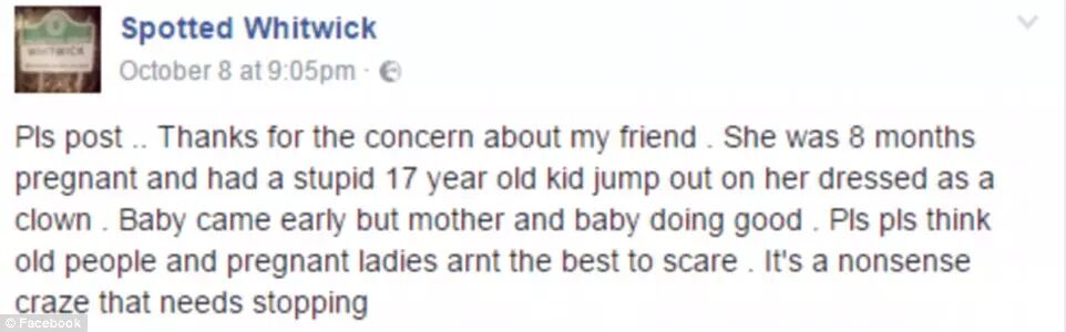 10月8号,一位怀孕的母亲,在路上遇到一位打扮成小丑的17岁男孩,直接被吓得早产。万幸的是,宝宝和妈妈没有什么意外。