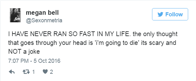 10月5日傍晚,名叫Bell 的女子在回家的路上遭到小丑的追赶。她说自己从未跑过那么快,当时脑子里只有一个想法: