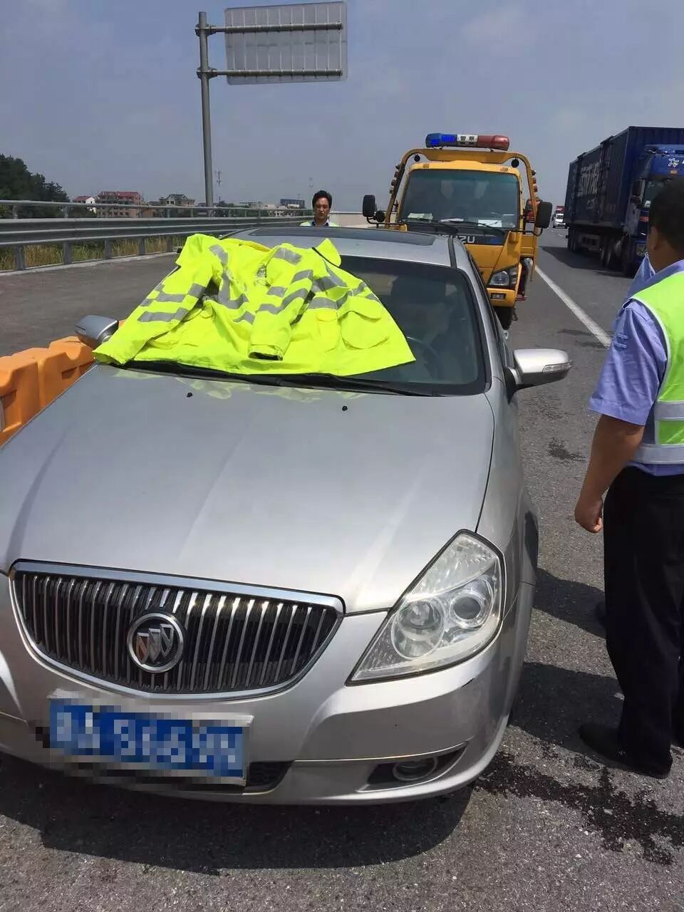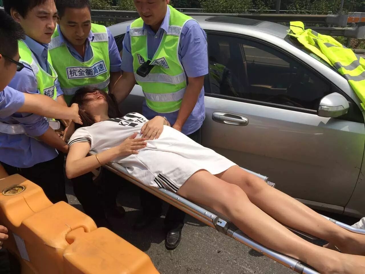 危急时刻,金华高速交警郑康康驾车巡逻经过,发现有一辆车违法停在硬路肩上,遂在作好预警措施后上前询问。在了解情况后,他迅速联系救护车。在等待救护车赶来的同时,郑康康会同随后赶来的施救人员,拿来雨衣为其遮挡烈日,买来矿泉水,还联系上潘女士的家人和朋友。最后,潘女士被抬上救护车,送到浦江人民医院。