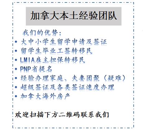 友情提示:办理移民最好还是找经验丰富的专业人士比较好,一旦拒签花再多钱也买不回你的移民身份了。夫妻以及家庭团聚欢迎扫描下方二维码联系我们,经验办理。