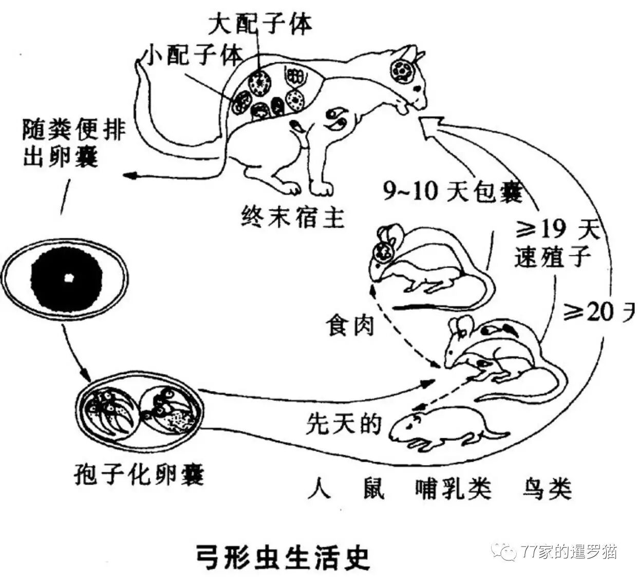 弓形虫是一种人畜共患的寄生虫病(所谓人畜共患,就是说人跟一些动物都会患病),不光是猫,兔子、猪、牛、狗、羊、老鼠、鸡、鸟等两百多种动物都可能患病。如果仅仅是因为猫会得弓形虫,就把它敬而远之,那么是不是应该把孕妇保护起来,让她不跟任何动物接触?不吃任何动物产品?弓形虫在猫的体内产生囊合子,并经粪便排出体外,而在其它动物体内,弓形虫并不产生囊合子。囊合子就相当于弓形虫的卵,在下面,我也会作虫卵来代替囊合子,毕竟这不是学术论文)