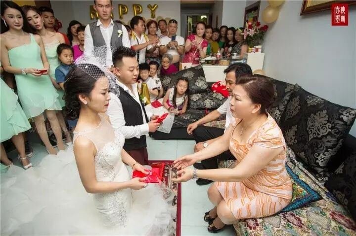 新郎与女方家人见面问候之后,应持捧花给房中待嫁之新娘,此时,新娘的伴娘团和姊妹团要故意阻挠新郎,不准新郎见新娘,在经过新郎苦苦哀求后,女方可提出条件要新郎答应,通常在经过一番讨价还价后都以999元红包礼成交,意喻『长长久久』。
