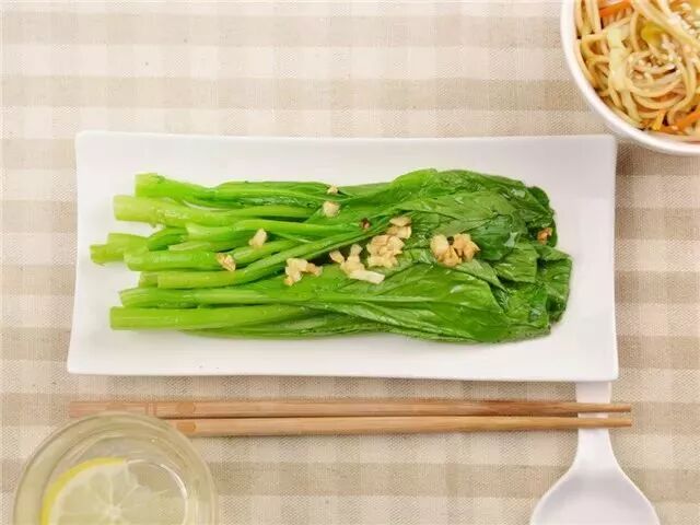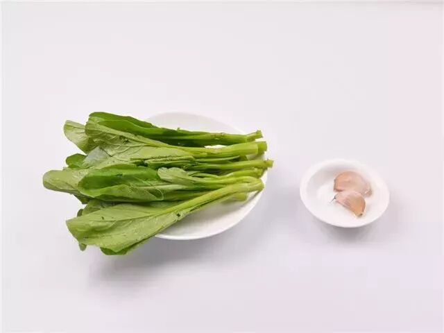 食材:菜心1把、大蒜2瓣、调和油半汤匙、盐1/2茶匙。