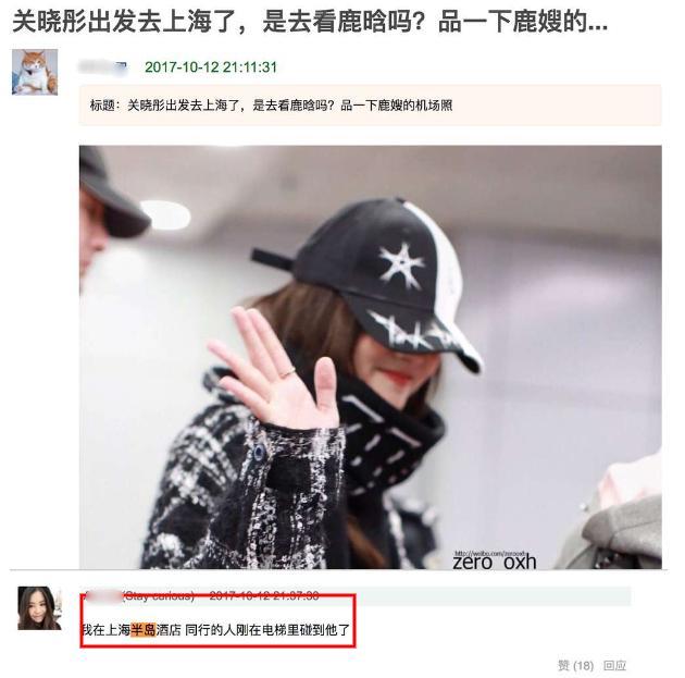 并且当晚有人曝光了自己在同一个上海半岛酒店碰到了关晓彤,时间恰巧也是10月12日晚上9点多。