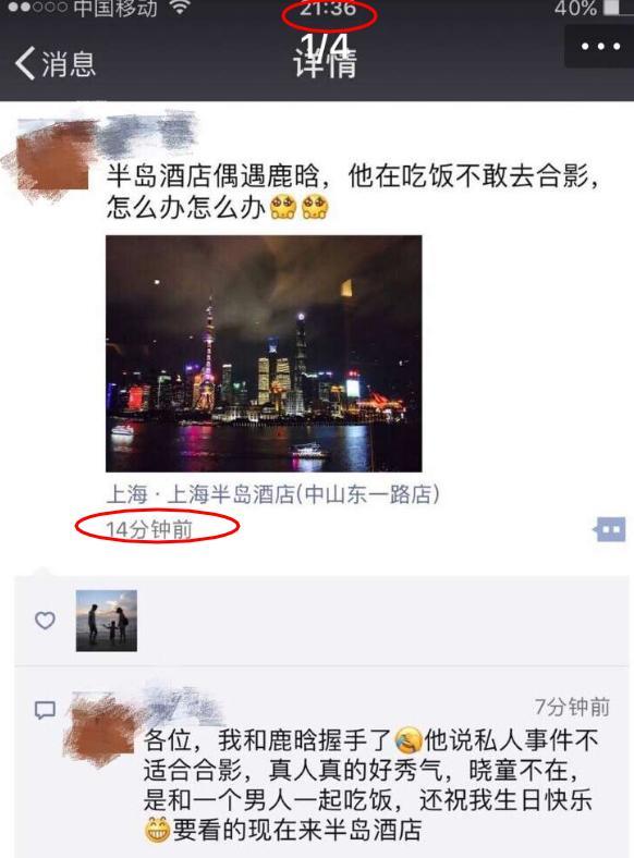 也有粉丝在朋友圈发文表示,自己在半岛酒店碰到了鹿晗,和一个男子吃饭,因为是私人时间不愿意合影。