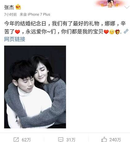 2017年9月26日,张杰宣布谢娜怀孕,说:我们有了最好的礼物。