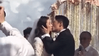 誓言说完之后,两个人都哭了,泪眼相望,老干部也把持不住了,情难自禁地捧着新娘的脸开始热吻,甚至还紧张激动到拇指颤抖……吻了9秒,寓意着长长久久。