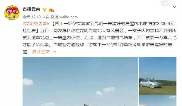10月14日,微博网友@直播云南 爆料称,国庆黄金周期间,有孕妇在昆明市寻甸县河口镇的草场游玩时,在未建好的房屋内小便,被河口镇北大营村村民撞见认为“晦气”,索要1万多元“挂红费”。