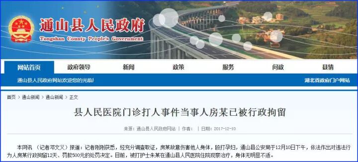 最新消息,倍受舆论关注的“城管局长妻子殴打怀孕护士”事件,湖北省咸宁市通山县政府第3次对外发布通报:经充分调查取证,房某故意伤害他人身体,殴打孕妇,通山县公安局于12月10日下午,依法作出对违法行为人房某行政拘留12天、罚款500元的处罚决定。目前,被打护士朱某在通山县人民医院住院观察治疗,身体无明显不适。