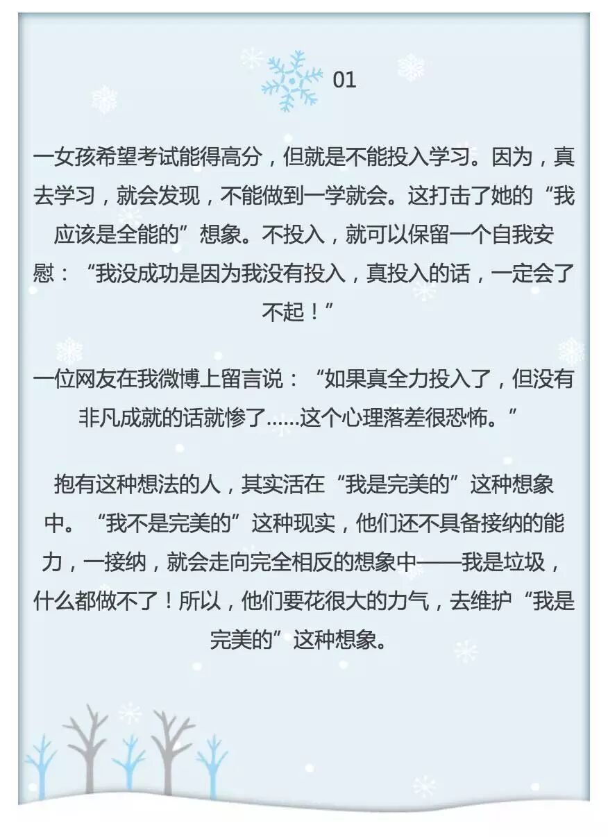原则是:觉知自己对全能自恋的渴求,以及对彻底无助的恐惧与抵触,从力所能及的事开始,一步步去做好自己该做的事,轻易不言退。不追求完美,也不被无助征服,最终你会与事情建立深刻关系,享受这个不完美的过程,并体验到自信。