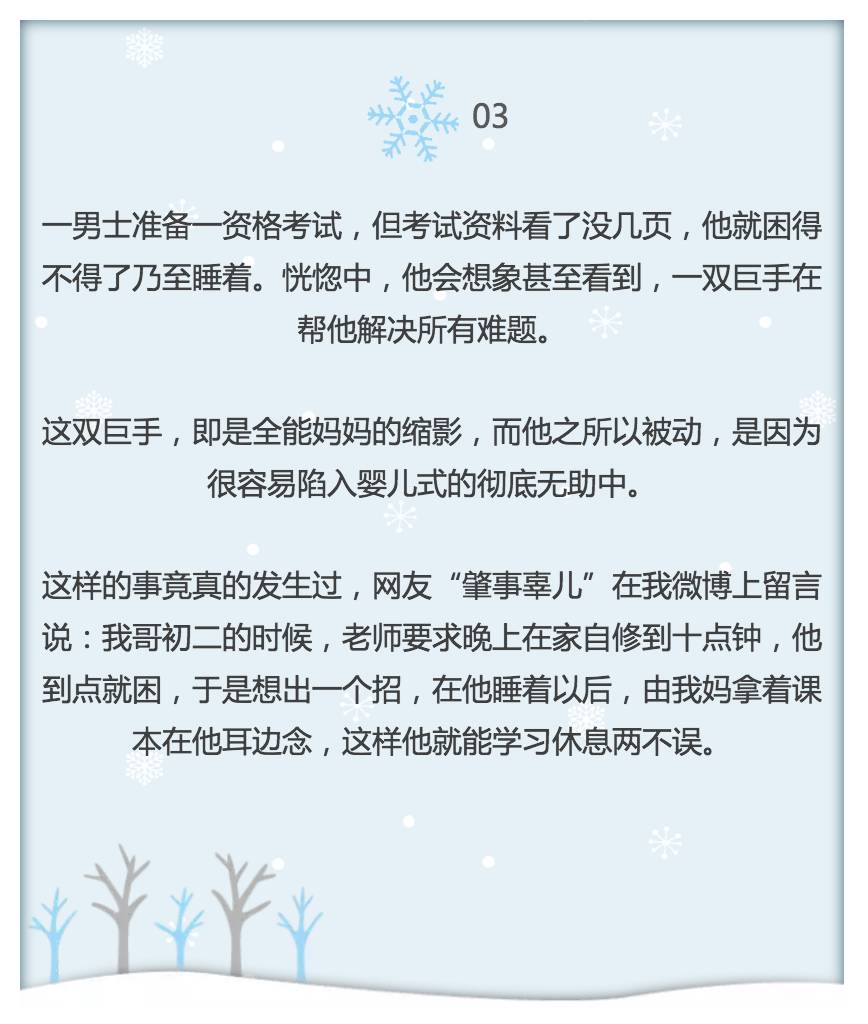 如果是妈妈的话,则容易是,妈妈极力想给孩子创造完美的养育环境。但仔细看就会发现,这个完美的养育环境,在剔除掉所有不利因素后,就很像是一个真空了。这样做的妈妈,她们婴儿时要么常被伤害,要么严重被忽视。