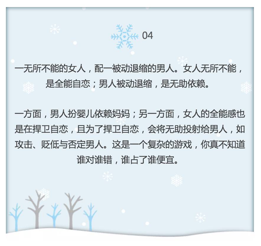 或者是,两个人构建一个自恋一个无助的关系,结果扮演自恋的越来越累,而扮演无助的越来越无能,甚至僵尸化。