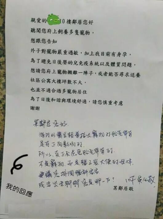 台湾一位网友在脸书上po出了邻居在他家门口贴上的字条。总结起来内容就是:听说您家里宠物多,但是我怀孕了,担心日后婴儿免疫系统及体质有问题,希望您能把狗子送走。