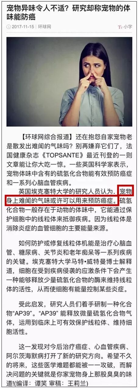 昨天推送的内容中有提到,宠物的异味可以防癌。环球网也对这个消息进行了报道!