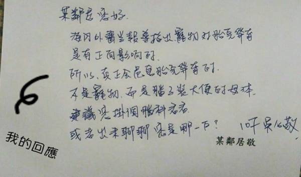 于是也留言回怼:“某邻居您好,海内外医学报导指出,宠物对胎儿发育是有正向影响的,所以真正会影响胎儿发育的,不是宠物,而是‘脑子装XX的母体’,建议您挂个脑科看看,或者出来聊聊您是哪一户?”