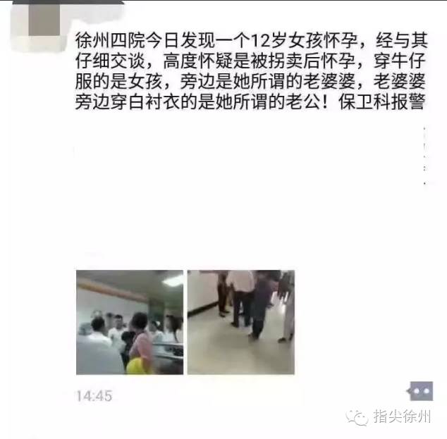这两天,一则信息在徐州人的朋友圈疯传,内容称,4日上午,一名看起来十分年幼的女孩,在一男一女的陪同下来到市中心医院做孕检,医院怀疑女孩未成年,且有可能是被拐卖,于是报警。